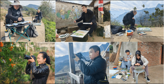 驻村书记曹慕岚同志及村委李书记对专家及研究生的到来表示热烈欢迎。随即,孙载斌院长,杨晓明教授,陶昌平教授和2位硕士研究生开始选点创作写生作品,陈奉雷博士和李沁苡博士分别以《仙山的美景》和《秋日乡景》为主题创作风光摄影系列作品。专家们及硕士研究生以饱满的热情发挥自己艺术特长,经过2个小时的创作,共为仙山村留下写生作品5幅,摄影作品12幅,圆满完成了此次专家服务基层活动的目标任务。