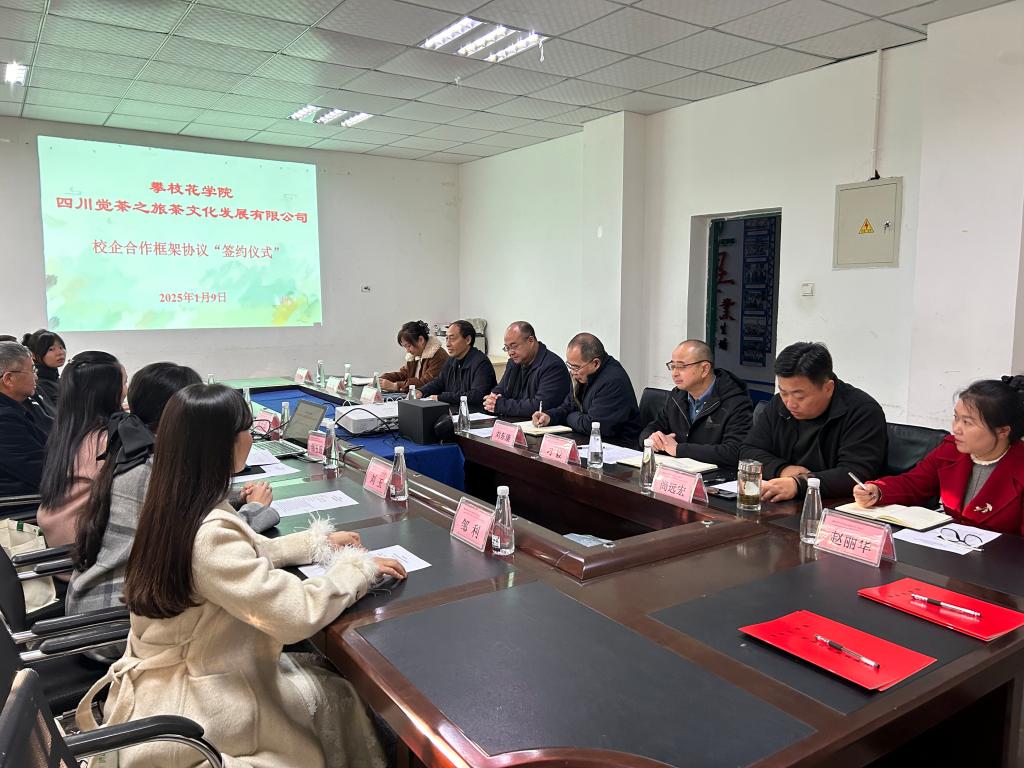 1月9日下午,我校与四川觉茶之旅文化发展有限公司校企合作签约仪式在博学楼202会议室举行。四川觉茶之旅文化发展有限公司领导班子、我校生化学院(农学院)相关领导参加仪式,我校党委副书记、纪委书记彭徐出席签约仪式并讲话。仪式由生化学院(农学院)院长朱学军主持。