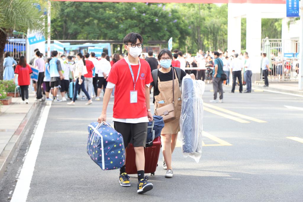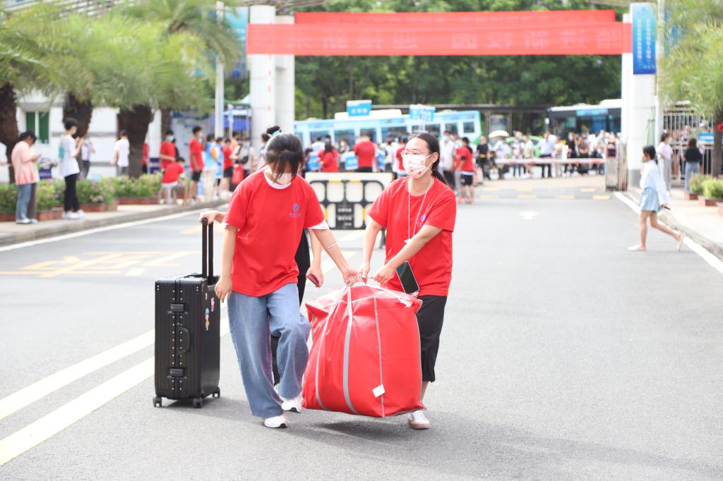 “自律攀大人”红色志愿者奔波在迎新点、香樟路和宿舍之间,刚入校的新生也积极加入“自律”队伍迎接新同学,帮新生搬运行李,搭载校园观光车,迅速顺利地完成了入学流程。
