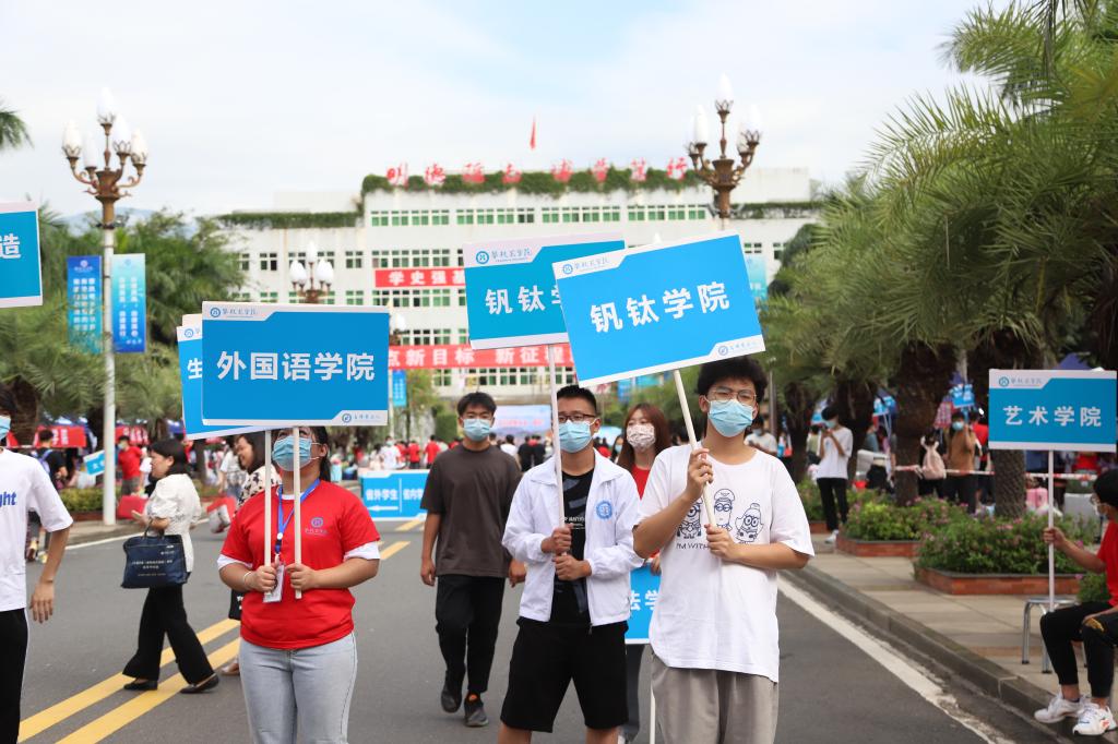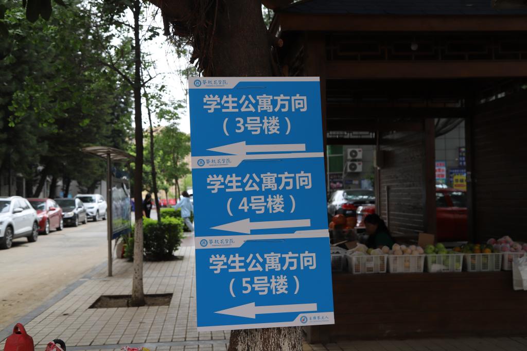 “自律攀大人”logo接机牌、指示牌、横幅指引着新生走进学院,走向自律。