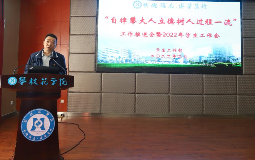 为全面加强三全协同育人,实现五育融合并举,落实落细十大育人工作体系,推进立德树人过程一流,打造“自律攀大人”文化品牌,2月28日,我校在办公室四楼附楼召开“自律攀大人立德树人过程一流”工作推进会暨2022年学生工作会,“十大育人过程一流实施方案”牵头单位相关负责人、各二级学院党组织负责人及分管学生工作领导,学工部、团委负责人参加会议。党委书记王斌出席会议并总结讲话,会议由党委副书记胥刚主持。