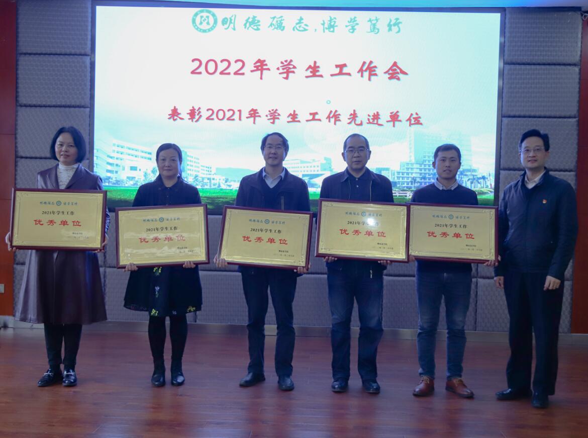 在随后召开的2022年学生工作会上,学工部、团委分别就2022年学生工作要点、共青团工作要点进行汇报,并就具体工作进行了安排部署。会议还表彰了2021年学生工作优秀单位和优秀辅导员,王斌为获得学生工作优秀单位的二级学院颁发奖牌。
