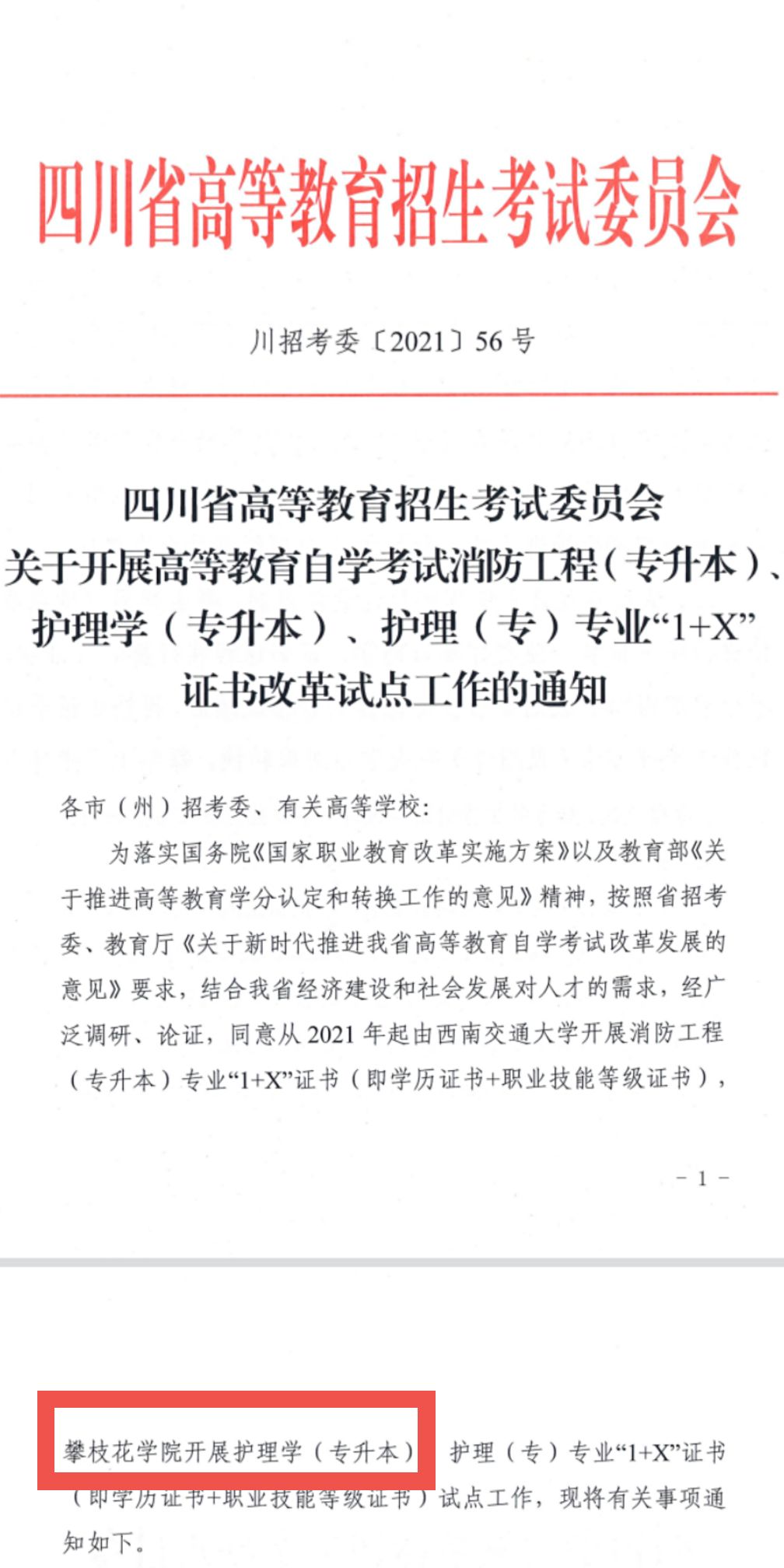 近日,四川省高等教育招生考试委员会下发《关于开展高等教育自学考试消防工程(专升本)、护理学(专升本)、护理(专)专业“1+X”证书改革试点工作的通知》(川招考委 [2021] 56号)文件,批准攀枝花学院开展四川省高等教育自学考试护理学(专升本)、护理(专)“1+X”证书改革试点工作。