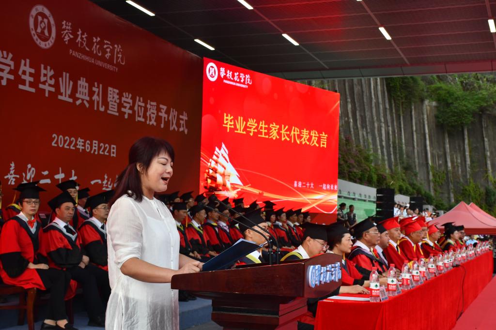 智能制造学院优秀退伍大学生李孟鲜家长张彤彤代表全体家长致谢攀大,感谢所有助力孩子成长成才的教职工,寄语毕业生铭记母校恩情,不负老师培养,常回“家”看看,努力回馈社会。