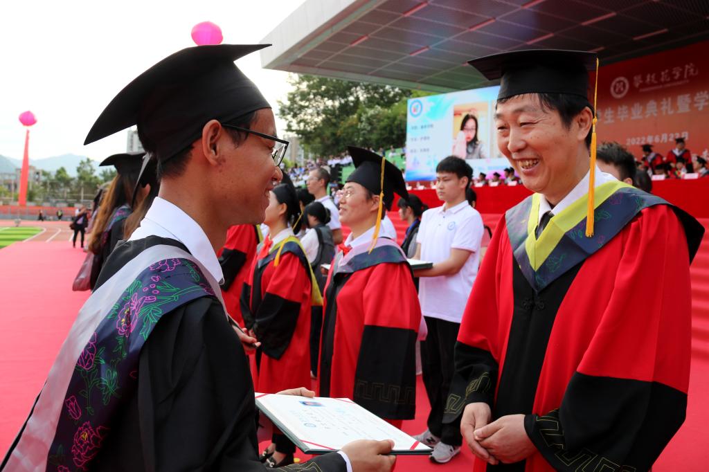 6月22日上午,我校在田径运动场隆重举行2022届学生毕业典礼暨学位授予仪式。党委书记王斌教授,党委副书记、校长王曙光教授,党委副书记、纪委书记彭徐教授,党委副书记胥刚教授,副校长刘立新教授、石维富教授、王兵教授、张旭辉教授出席典礼并担任授位导师。各二级学院、各单位负责人,教师代表、校友代表、毕业生及家长代表共计3000余人参加典礼。典礼由刘立新主持。