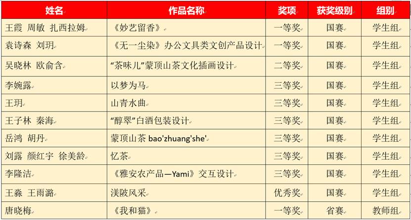 在本次全国总决赛中,王霞、周敏、扎西拉姆设计的作品《妙艺留香》和袁诗森、刘玥设计的作品《<无一尘染>办公文具类文创产品设计》获得学生组一等奖。数字媒体艺术专业教师陈璇荣获“优秀组织教师”。