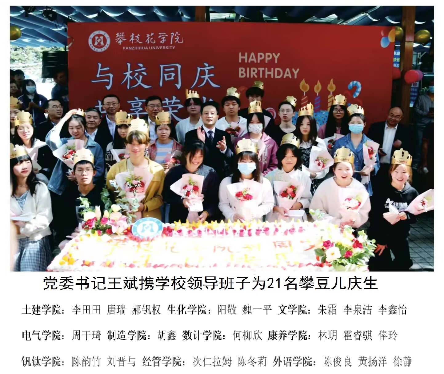 11月11日是学校39岁生日,也是学校第六届校园社团美食文化节活动开幕的第一天。当天中午,“与校同庆、共享荣光”生日会在美食文化节第一分会场举行。党委书记王斌、纪委书记彭徐,副校长刘立新、朱波强、王兵、张旭辉亲临生日会现场,与外语学院20级徐静、生化学院22级阳敬等21名与学校同天生日的攀豆儿一起过生。