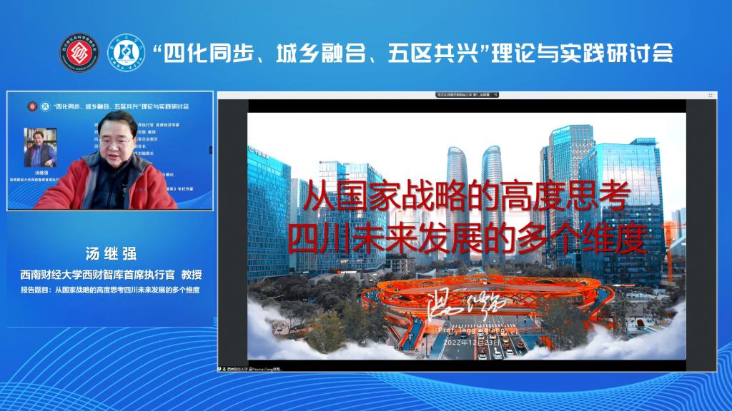 研讨会上,西南财经大学西财智库首席执行官汤继强教授,四川外国语大学成都学院党委书记杨继瑞教授,攀枝花学院副校长张旭辉教授、成都理工大学社会科学处处长高辉教授等8位专家学者先后以《从国家战略的高度思考四川未来发展的多个维度》《安宁河谷经济走廊振兴:“四化同步、城乡融合、五区共兴”的缩影》《五区共兴背景下攀西康养产业融合发展的模式与路径》等为主题作报告,紧扣“四化同步、城乡融合、五区共兴”中心工作,就成渝双城经济圈、安宁河流域、五区协同、特色产业发展等作了充分的交流。