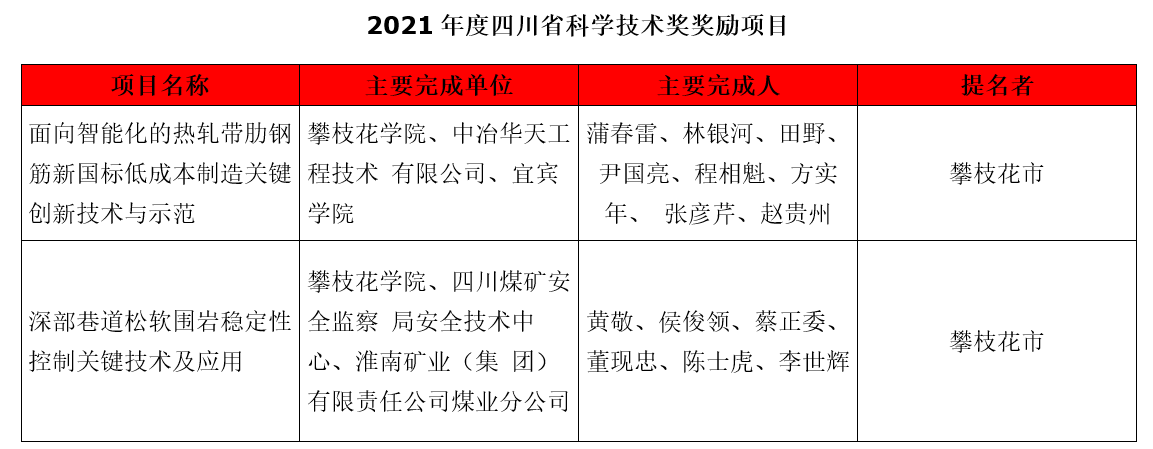 近日,四川省科学技术厅公布了2021年度四川省科学技术奖奖励项目名单,我校程相魁参与项目《面向智能化的热轧带肋钢筋新国标低成本制造关键创新技术与示范》荣获科技进步二等奖,侯俊领主持项目《深部巷道松软围岩稳定性控制关键技术及应用》荣获科技进步三等奖。
