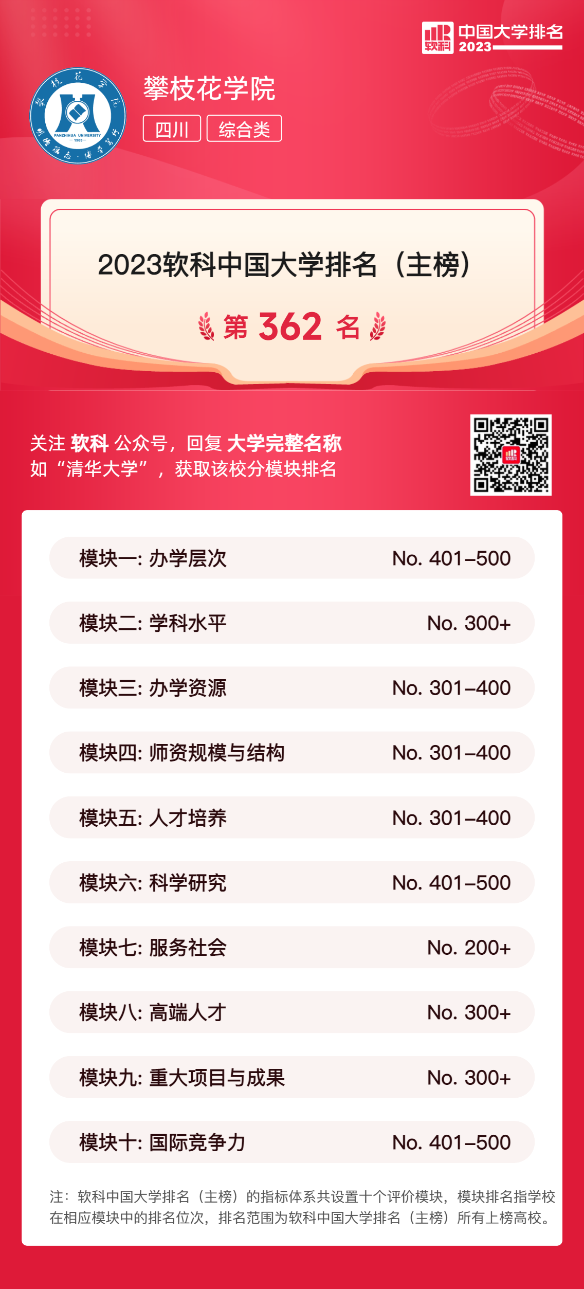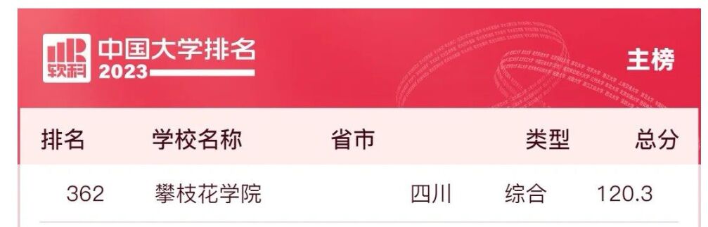 今日,高等教育专业评价机构软科正式发布“2023软科中国大学排名”,我校综合排名和各项指标稳中有升,位列362名,继2022年大幅跃升90个位次后,再次提升9个位次,在四川省内高校排名15位。