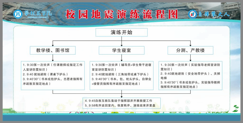 30秒后,模拟第一次地震波结束,在授课教师、志愿者和公寓管理员等指引下,学生们迅速从教室、寝室、图书馆、实验楼等地有序疏散。