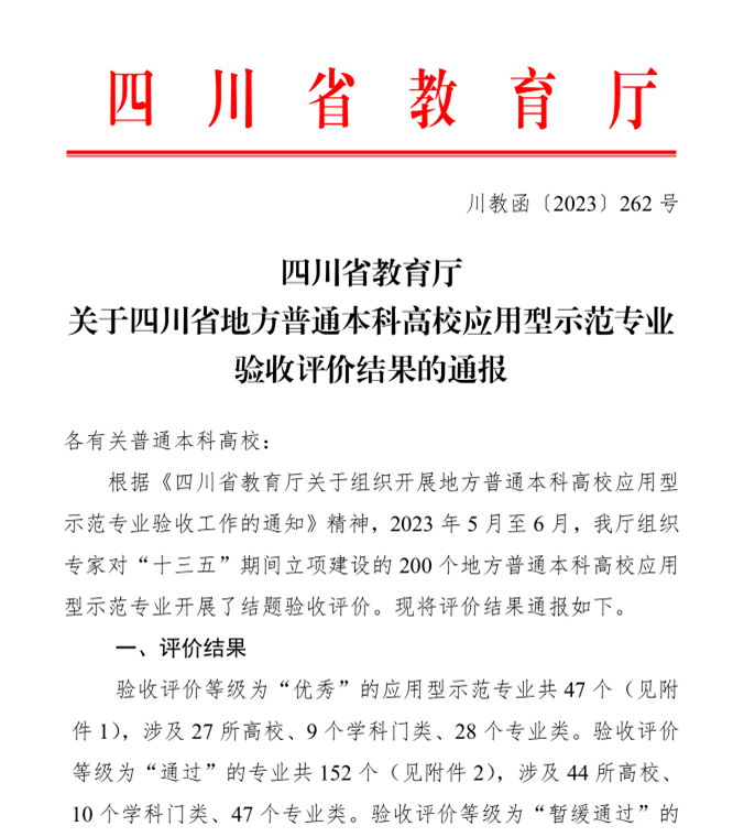 近日,四川省教育厅公布了《四川省教育厅关于四川省地方普通本科高校应用型示范专业验收评价结果的通报》(川教函〔2023〕262号),我校材料科学与工程、软件工程专业验收评价等级为“优秀”,电气工程及其自动化、土木工程、会计学三个专业也顺利通过项目验收。