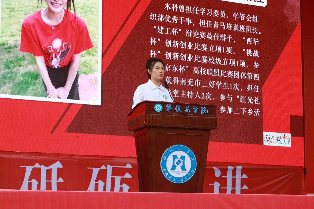 来自土木与建筑工程学院材料工程专业硕士研究生余泞利代表2023级新生发言。作为学校首届硕士研究生,她首先感谢了学校对首届研究生的关心和爱护,进而表示作为新生要尽快适应新生活,树立明确的目标、锤炼品行修养、提升责任感、使命感,做一名敢想敢为又善作善成的攀大人!