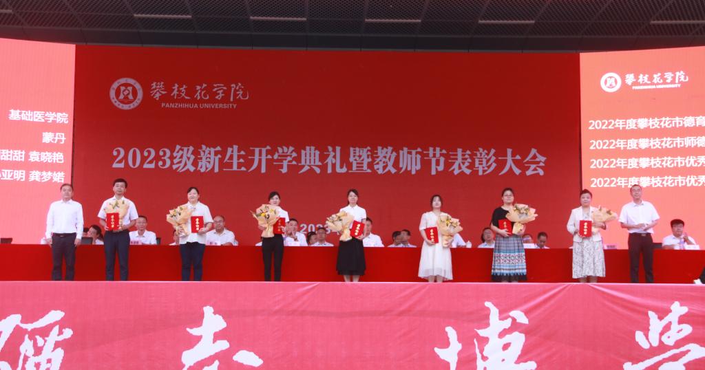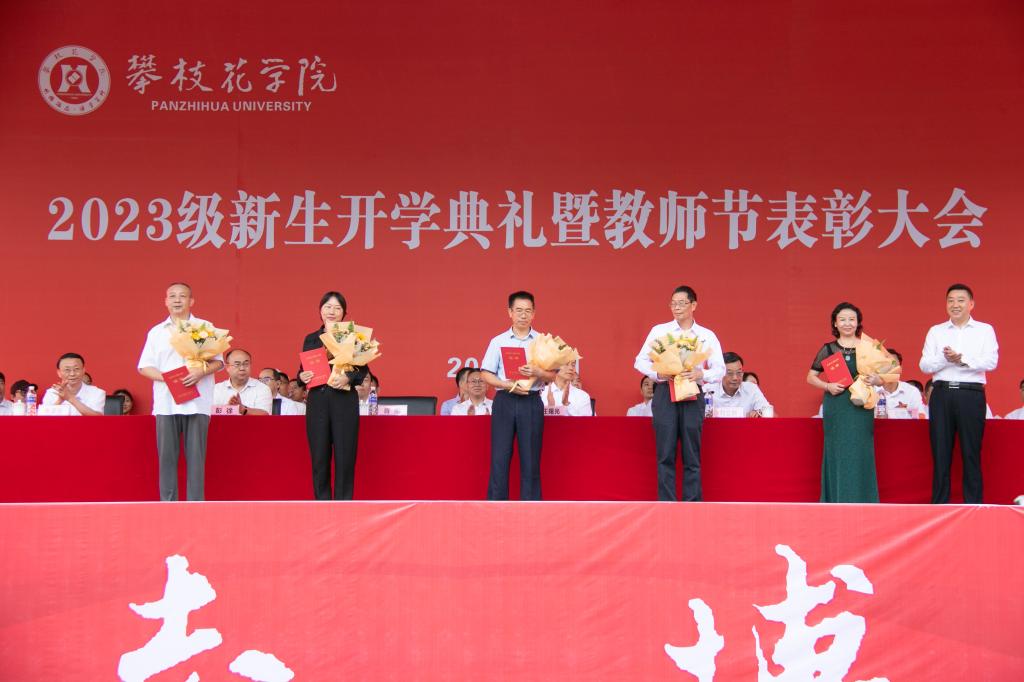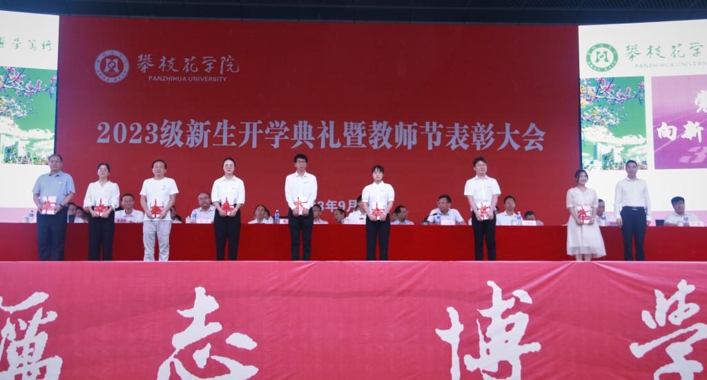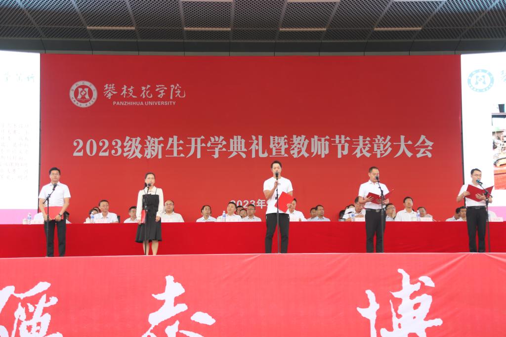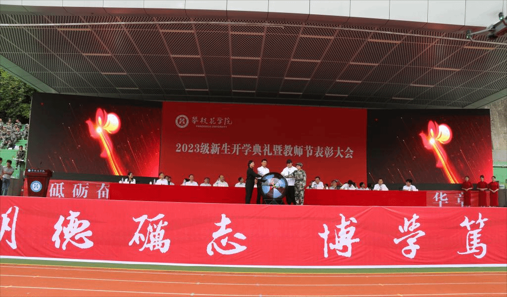 9月10日上午,迎着和煦秋风,伴着绵绵细雨,我校在南苑运动场隆重举行2023级新生开学典礼暨教师节表彰大会,喜迎来自全国31个省、市、自治区的3800余名新同学,共庆第39个教师节。党委书记胥刚,党委副书记、校长王曙光,省纪委监委驻攀枝花学院纪检监察组组长、党委副书记、纪委书记彭徐,党委副书记、副校长刘立新,副校长朱波强、石维富、王兵、张旭辉出席大会,“天府峨眉”计划青年人才郭翠、牛强博士应邀就坐主席台,机关职能部门负责人、各教学单位党政负责人,优秀教师代表、全体新进教师、2023级全体新生共4300余人参加大会。大会由刘立新主持。