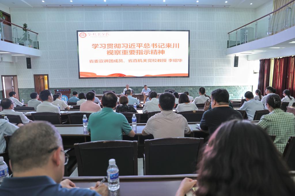 为深入学习贯彻习近平总书记来川视察重要指示精神,引导全省教育系统广大党员干部、师生切实把思想和行动统一到习近平总书记重要指示精神上来,9月15日,学校召开党委理论学习中心组2023年第十一次学习(扩大)会,习近平总书记来川视察重要指示精神省委宣讲团高校宣讲分队成员、省委省直机关党校哲学•社会学教研部主任李绍华教授应邀作宣讲报告。全体校领导、两委委员、中层干部、思政课教师、专职辅导员、青年学生代表等共150余人参加报告会。党委书记胥刚主持会议并总结讲话。