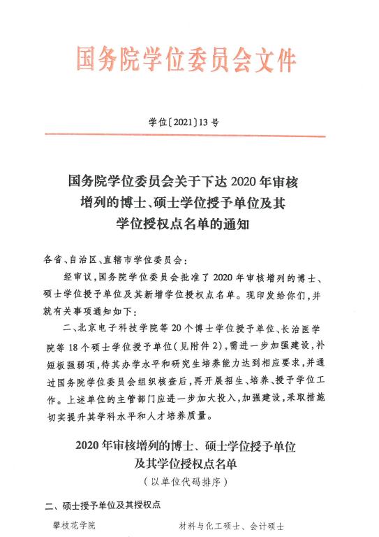 2021年10月,攀枝花学院增列为硕士学位授予单位,材料与化工、会计两个专业获批硕士学位点。2022年8月,学校顺利通过了硕士学位授予单位建设进展核查,将从2023年起正式开展招生、培养和学位授予工作,学校再次实现办学层次提升,在此基础上,列入博士点建设单位。