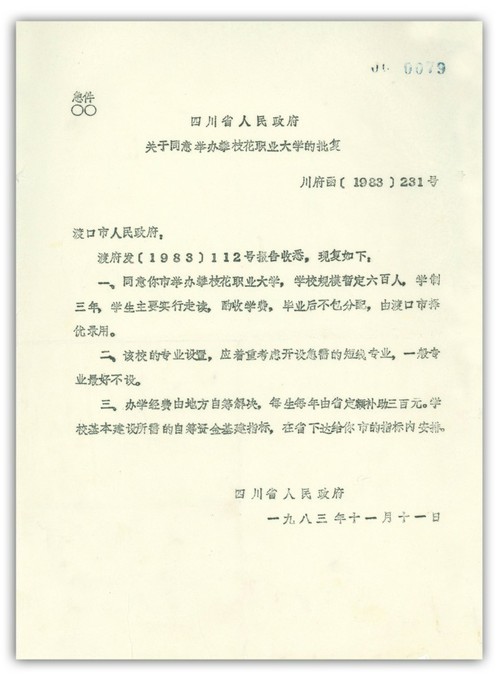 1983年11月11日,四川省人民政府批复,同意渡口市举办攀枝花职业大学,攀枝花大学至此成立。从此,攀枝花人有了属于自己的大学。
