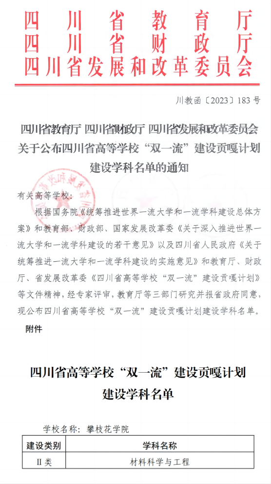 2023年6月,根据《四川省教育厅四川省财政厅四川省发展和改革委员会关于公布四川省高等学校“双一流”建设贡嘎计划建设学科名单的通知》,我校材料科学与工程入选四川省高等学校“双一流”建设贡嘎计划建设学科Ⅱ类建设学科。同月,我校化学工程与技术、工商管理学入选四川省高等学校“双一流”建设贡嘎计划培育学科。