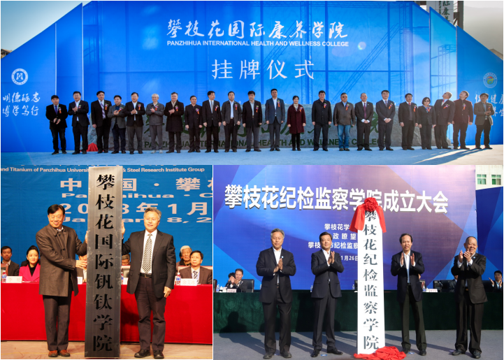 2016年12月26日,“攀枝花国际康养学院”挂牌成立,建成全国第一所康养学院。2018年1月8日,攀枝花国际钒钛学院、攀枝花国际钒钛研究院、中国钢研攀枝花学院钒钛技术创新中心挂牌成立,建成全国第一所钒钛院校。2018年11月26日,攀枝花纪检监察学院在我校挂牌成立,是四川省首家纪检监察学院。