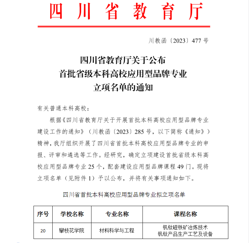 近日,四川省教育厅公布了首批省级本科高校应用型品牌专业及课程立项名单,经专家通讯评审、会议评审和厅长办公会审议等程序,我校钒钛学院材料科学与工程专业获批首批省级本科高校应用型品牌专业,为我校唯一入选专业。同时,“钒钛磁铁矿冶炼技术”和“钒钛产品生成工艺及设备”两门课程被列入应用型品牌课程建设名单。