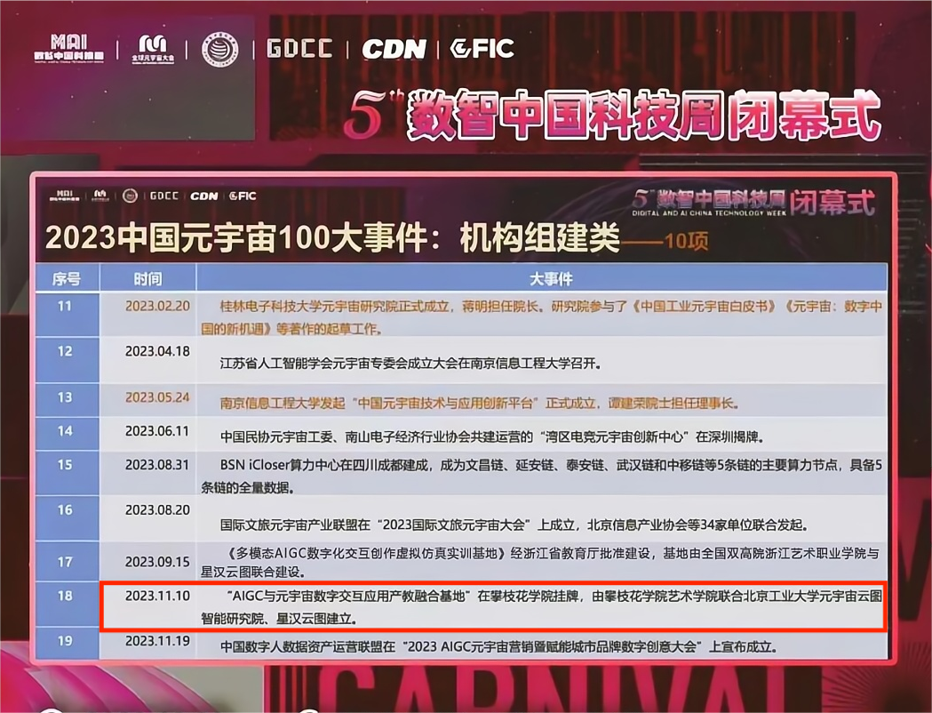 我校艺术学院"AIGC与元宇亩数字交互应用产教融合基地"入选2023年中国元宇宙100大事件,是学校在元宇亩教育领域的一次重要突破,也是学院积极响应国家新时代高等教育改革发展的一次有力回应。学校将继续坚持以人才培养为中心,以产教融合为动力,以创新创业为导向,以科技服务为支撑,以社会需求为导向,为元宇亩教育的发展做出更大的贡献。