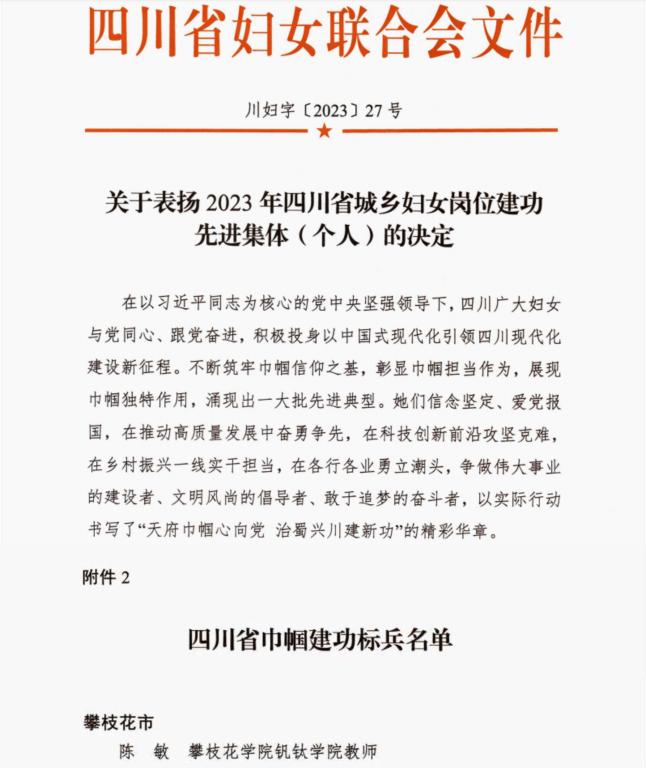 近日,四川省妇联印发《关于表扬2023年四川省城乡妇女岗位建功先进集体(个人)的决定》,我校钒钛学院教师陈敏被授予“四川省巾帼建功标兵”。