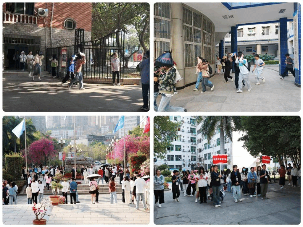 警报结束后,学生在工作人员的指引下迅速从图书馆、教室、寝室等地按应急疏散路线有序疏散到安全区域。