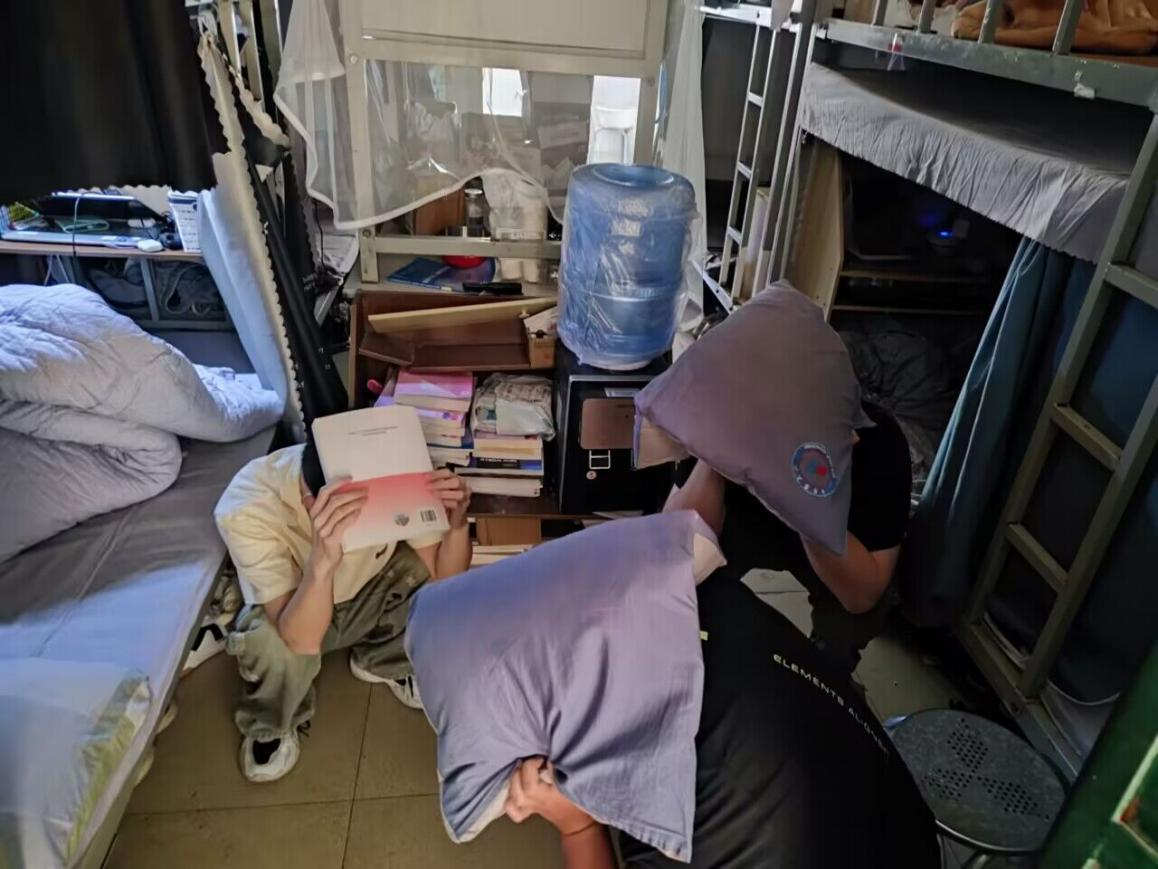 9时30分学生在教师、辅导员、公寓管理员的指导下用书顶在头顶躲在桌下、墙角紧急就地避险。