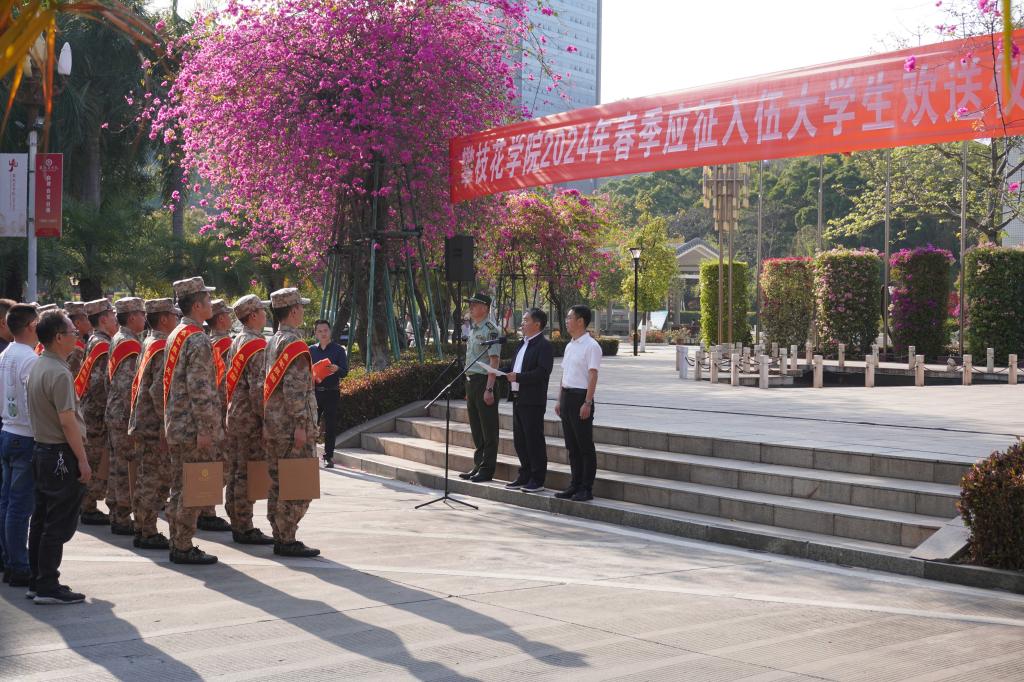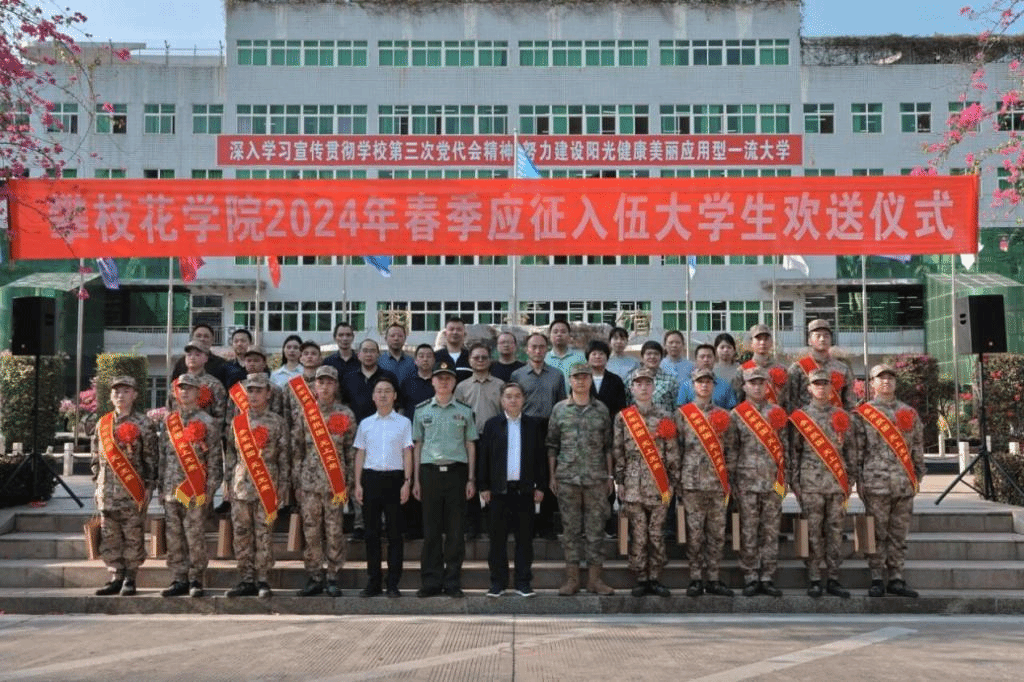 3月15日,我校举行应征入伍大学生欢送仪式。副校长王兵、攀枝花市东区人武部上校部长康贺卫、学校武装部负责人以及各二级学院分管学生工作领导、辅导员和教师代表、学生代表等参加。