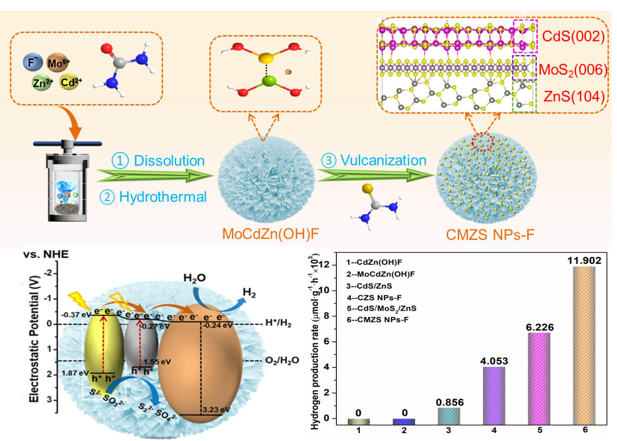 该成果针对煤、石油等能源短缺问题和环境污染问题,开发清洁可再生能源氢能。利用基于光生载流子转移的形态工程和通道构建技术设计合成了高效产氢光催化剂CMZSNPs-F。Zn(OH)F多功能平台限制了CdS/ZnSNPs的生长,提供了加速载流子界面转移的F-离子。同时,MoS2加速了光生电荷的快速捕获和转移使CMZSNPs-F的产氢速率达到11902μmol·g-1·h-1,是CdS/ZnS的13.9倍。通过实验研究和密度泛函数理论计算结果得到,CMZSNPs-F的活性位点数量较多,e−–h+复合效率较低,光生电荷转移效率较高,促使产氢速率大大提高。该成果在四川省科技计划项目、油气田应用化学四川省重点实验室、四川省高等学校绿色化学重点实验室开放项目、攀枝花市科技局项目资助下完成。