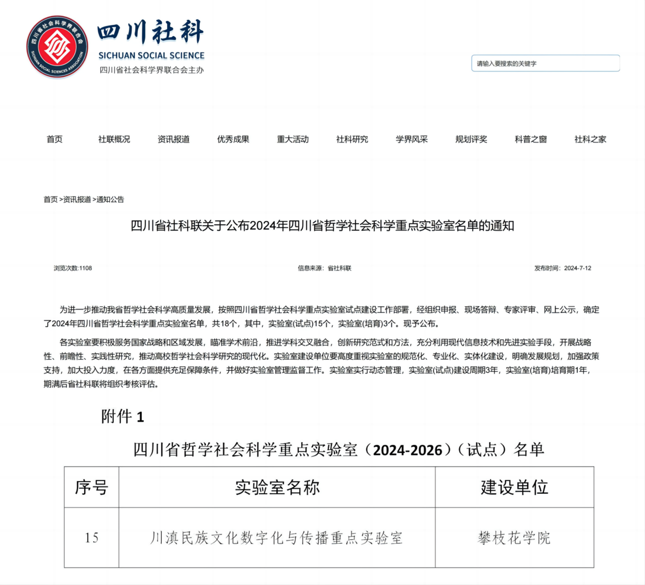 近日,四川省社科联正式公布了2024年四川省哲学社会科学重点实验室名单,全省共31个实验室参与申报,最终入选18个,其中,实验室(试点)15个,实验室(培育)3个。由我校文学院牵头申报的“川滇民族文化数字化与传播重点实验室”成功获批。