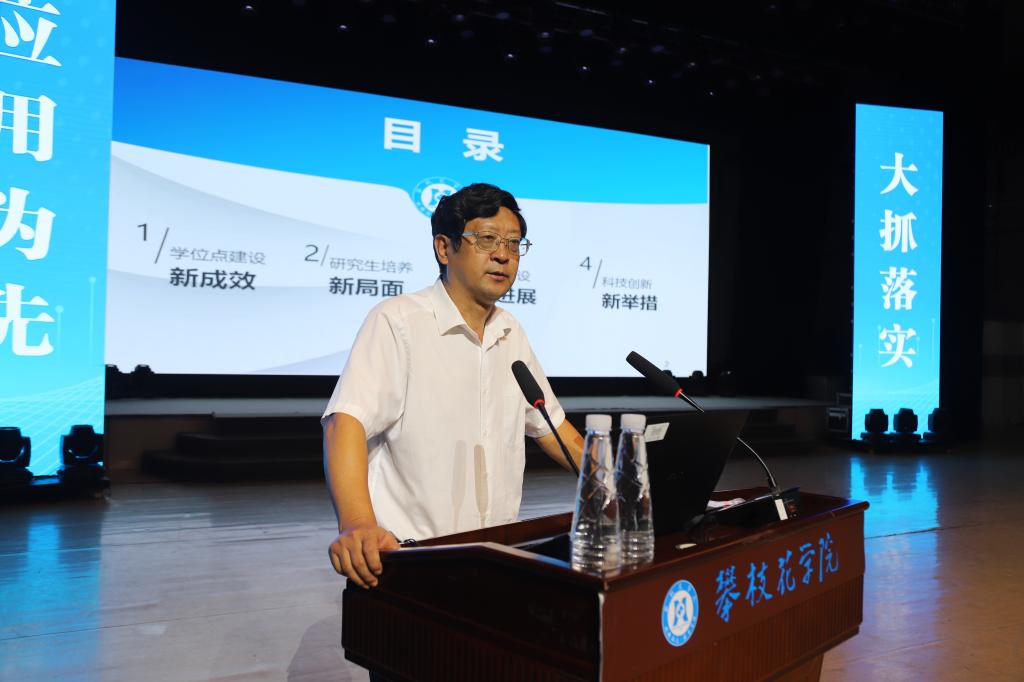 党委常委、副校长石维富重点围绕学科建设,以《瞄准升大目标 打造学科高峰》为题作专题发言。他通过翔实的数据和材料展示了学校学位点建设取得的新成效、研究生培养开创的新局面、学校科研发展的新举措,并对学位点建设、研究生教育、未来三年科研任务及规划等重点工作进行了安排部署。他指出,学校坚持以学科建设为龙头、以优势专业为突破,坚定不移、多学科并进办好研究生教育,围绕学校“升大”“更名”战略目标,实现关键科研指标突破,提升学校综合实力,推动应用型一流大学建设。