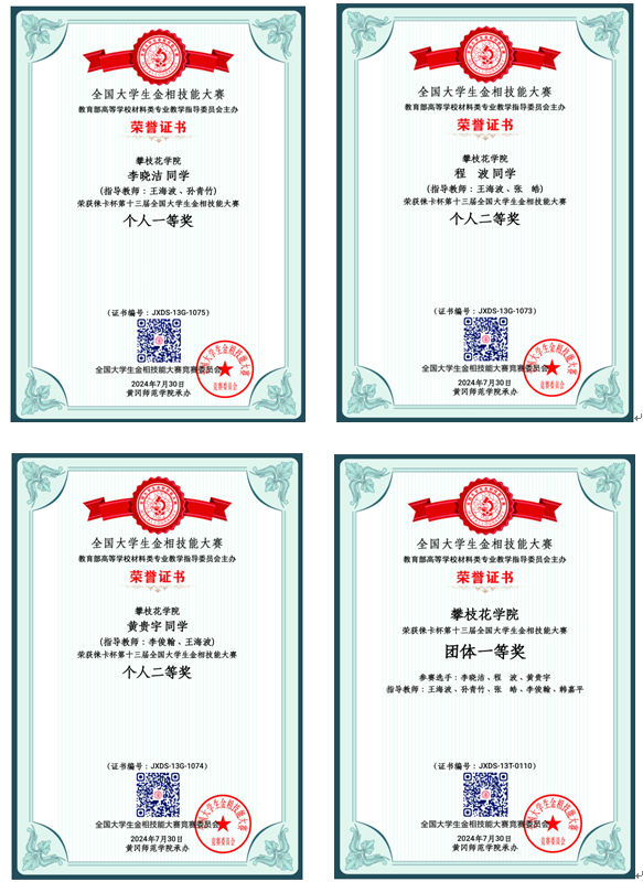 7月25日-29日,由教育部高等学校材料类专业教学指导委员会主办的第十三届全国大学生金相技能大赛决赛在黄冈师范学院成功举行。经过为期三天的激烈角逐,我校钒钛学院李晓洁同学荣获第十三届全国大学生金相技能大赛个人一等奖,程波、黄贵宇两位同学分别荣获个人二等奖。我校继2023年后再次斩获团体一等奖(位列全国第9名),成为首个蝉联团体一等奖的四川省高校。钒钛学院王海波和韩嘉平作为指导教师带队参加了分赛区复赛和大赛决赛,并获得“优秀指导教师”称号。