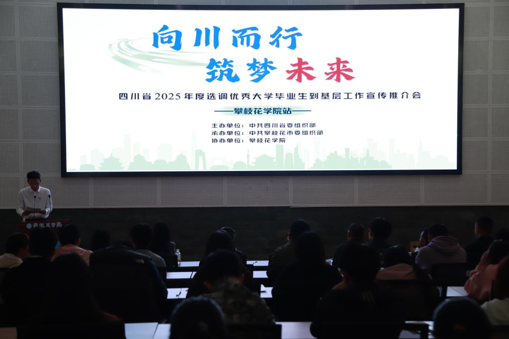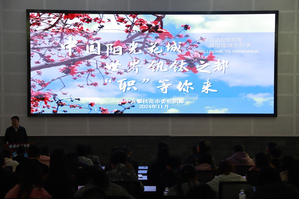 省委组织部相关负责同志以“向川而行 筑梦未来”为题宣传四川省情和选调生政策,邀约攀枝花学院优秀学子加入四川选调生队伍,投身治蜀兴川火热实践,在巴蜀大地书写人生精彩华章!他通过生动的案例和详实的数据,向同学们展示了选调生工作的广阔舞台和无限可能,使同学们对选调生政策有了更加清晰、全面的认识。