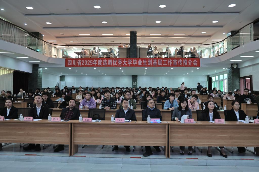 为进一步加大基层选调生招录政策宣传力度,吸引更多优秀大学毕业生投身基层,11月6日上午,由四川省委组织部主办、攀枝花市委组织部承办、攀枝花学院协办的“四川省2025年度选调优秀大学毕业生到基层工作宣传推介会”在学术报告厅隆重召开。省、市、县(区)委组织部相关领导,学校副校长王兵,学校组织部、人事处、招就处相关负责人,基层选调生代表,学校2025届部分毕业生及毕业生辅导员220余人参加会议。