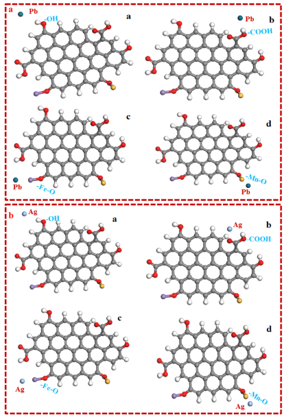 论文《Adsorption of Pb(II) and Ag(I) usingiron/manganese oxides modification biochar》以解决提钒尾渣中高品位铁锰的二次应用为前提,设计铁锰离子溶液浸渍油菜杆热解制备铁锰氧化物改性生物炭吸附重金属离子(Pb(II)和Ag(I))的新方法。Pb(II)和Ag(I)的主要吸附机理包括沉淀,阳离子交换,静电吸引,还原,络合和π-π相互作用。在生物炭上引入磁性物质可实现生物炭使用后在磁场条件下的快速回收,为其二次回收利用提供了可行性。