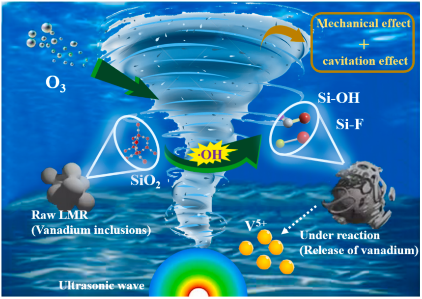 论文《Mechanism and kinetics study ofvanadium leaching from landfilled metallurgical residues by ultrasonic withozonation enhancement in a low-acid medium》研究了低浓度硫酸体系下臭氧催化协同超声外场强化浸出工艺处理提钒尾渣的有效性,超声臭氧协同作用下产生足量•OH促进硅酸盐包裹体中Si-O键到Si-F键的转变进程。臭氧绿色环保,易分解生成氧气,为臭氧强化超声外场协同浸出处理含钒尾矿产业化提供了可能。