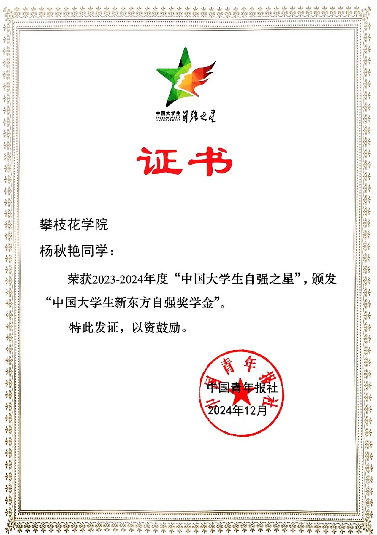 杨秋艳,女,汉族,中共预备党员。她自高中起兼职,通过勤工俭学和寒暑假工减轻家庭负担。曾任院分团委学生会主席、班级团支部书记、“方毅·钛班”文体委员等职;在学术与创新创业领域表现突出,曾获“第十三届“挑战杯”四川省大学生创业计划竞赛国家铜奖”“建行杯”第八届四川省国际“互联网+”大学生创新创业大赛省级银奖”“创青春”川渝青年创新创业大赛省级铜奖”“综合素质A级证书”及校级“优秀共青团员”“优秀学生干部”“国家励志奖学金”等荣誉20余项,并申报发明专利《钒钛磁铁矿选钛浮选捕收剂及钒钛磁铁矿选钛工艺》1项;她热心志愿服务,投身“携爱心进社区,创文明花城”等志愿服务,大学四年间累计志愿时长93.5小时,用实际行动诠释了自立自强、奉献社会的精神,展现了攀大青年学子的责任与担当。