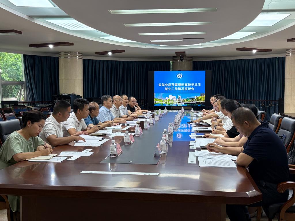 6月10日下午,省就业服务管理局党委书记、局长王祎,副局长唐勇带队省就业服务管理局就业指导处、失业保险处来校督导调研毕业生就业工作。攀枝花市政府副秘书长余万兵,攀枝花市人力资源和社会保障局党组书记、局长刘敏,党组成员、副局长徐洪江,攀枝花市教育和体育局党组成员、副局长李刚,副校长王兵陪同调研。