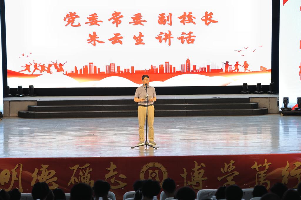 朱云生致辞,他向受表扬的优秀学子致以热烈祝贺,向辛勤耕耘的教师们表达诚挚谢意。他介绍了学校的办学特色、人才培养体系与特色育人模式,强调树立榜样是对学校价值追求的生动传承,优秀学生事迹分享更是一场跨越青春的精神接力。他勉励受表扬的优秀学生及全员上岸寝室成员,要以“归零”心态再出发,将优秀融入生命,用实际行动诠释榜样内涵,让青春在实干奋斗中绽放时代光彩。