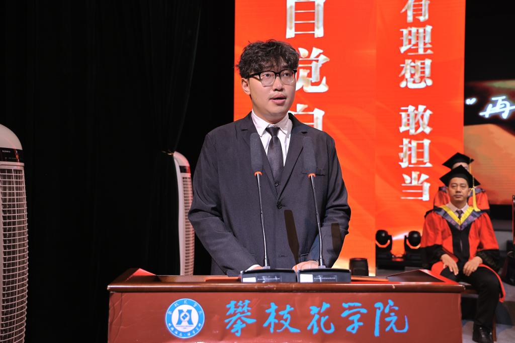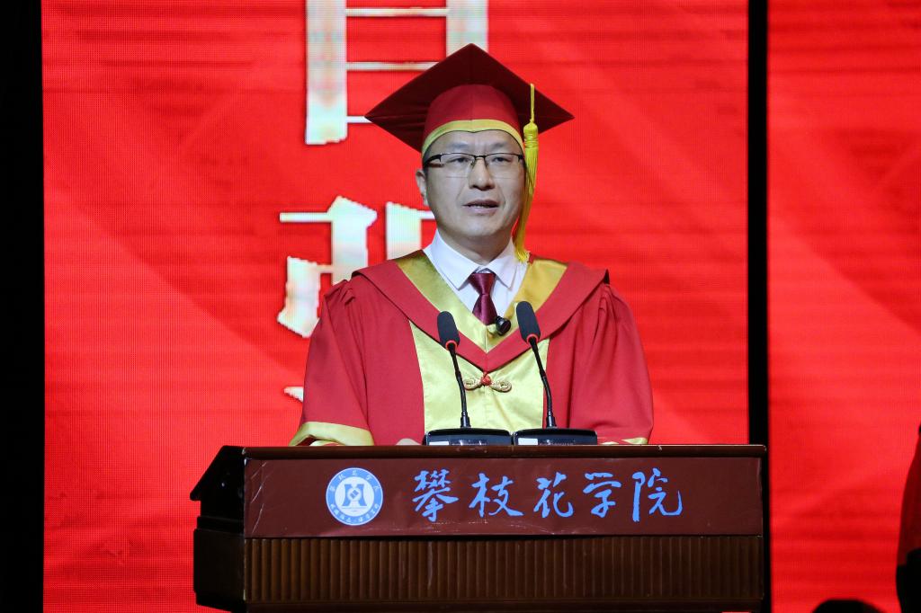 党委副书记、校长李兴贵作题为《“永攀”——向阳而生 向上攀登》毕业致辞。他回顾了毕业生们在校园的奋斗点滴,从清晨图书馆前的长队到深夜伏案钻研的身影,并对顺利完成学业、获得各类荣誉称号、继续读研深造、在创新创业等各类大赛斩获佳绩、携手奋进集体上岸、应征入伍、服务基层、扎根攀枝花的毕业生们表示热烈的祝贺。