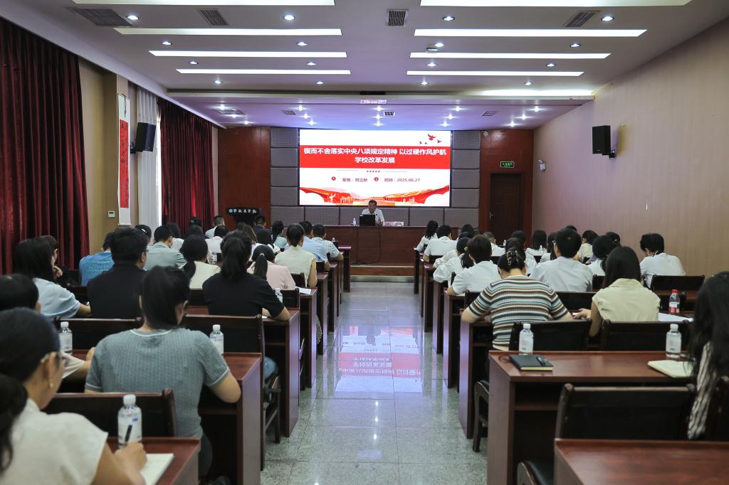 为扎实推进深入贯彻中央八项规定精神学习教育,6月27日上午,党委副书记刘立新以《锲而不舍落实中央八项规定精神以过硬作风护航学校改革发展》为题讲授专题党课。学校组织部、宣传部、统战部、团委、计划财务处、康养学院和基础医学院全体教师党员参加党课学习。