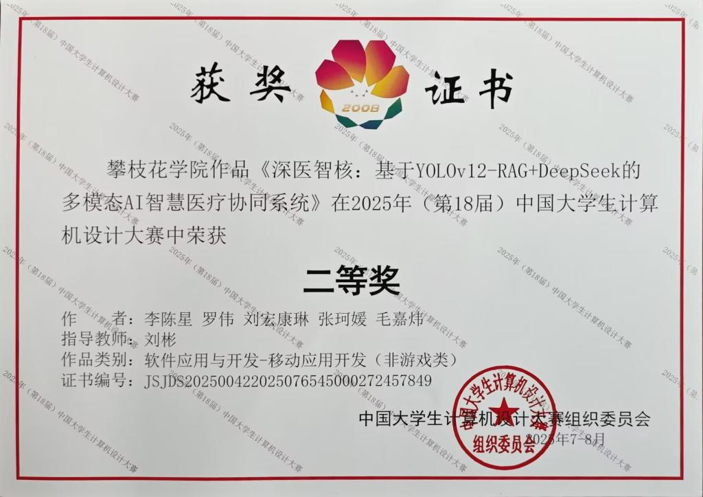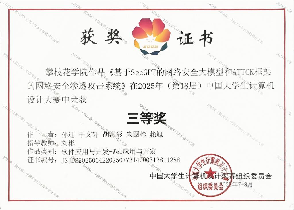 项目《深医智核:基于Yolo12-RAG+DeepSeek的多模态AI智慧医疗协同系统》(团队成员:李陈星、罗伟、刘宏康琳、张珂媛、吴星宇)与《基于HarmonyOS的国产化移动办公OA系统》(团队成员:孙旭阳、易小又、李念娇、董曦、唐旗)获全国二等奖;项目《基于SecGPT网络安全大模型和ATTCK框架的渗透攻击系统》(团队成员:孙迁、干文轩、胡洪彰、朱圆彬、赖旭)获全国三等奖,刷新了学校在该赛事中的最佳成绩记录。