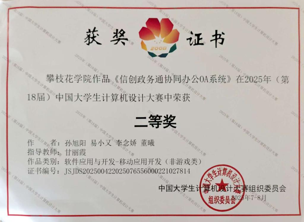 近日,2025年第18届中国大学生计算机设计大赛——软件应用与开发赛全国总决赛在山东泰安圆满落幕。本次大赛吸引全国500余所高校的2300余支队伍参赛,我校数学与计算机学院(大数据学院)刘彬老师、甘丽霞老师指导的三支团队分别获国家级二等奖2项、三等奖1项。