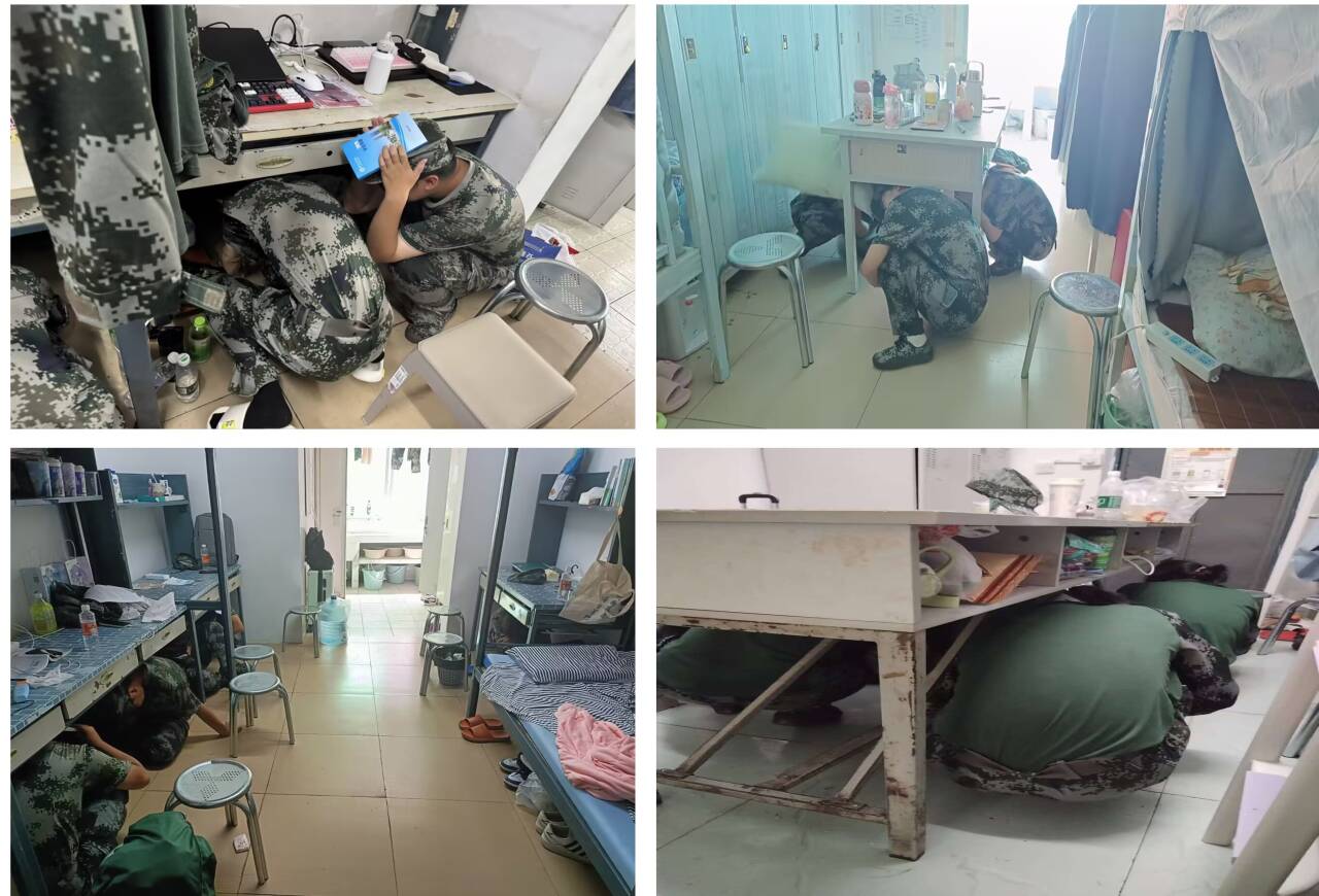 下午2时30分,警报响起,学生在公寓管理员和学生骨干的引导下迅速在寝室内实施紧急避险。