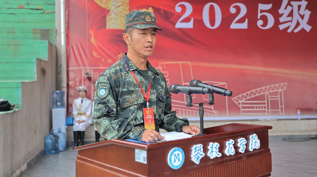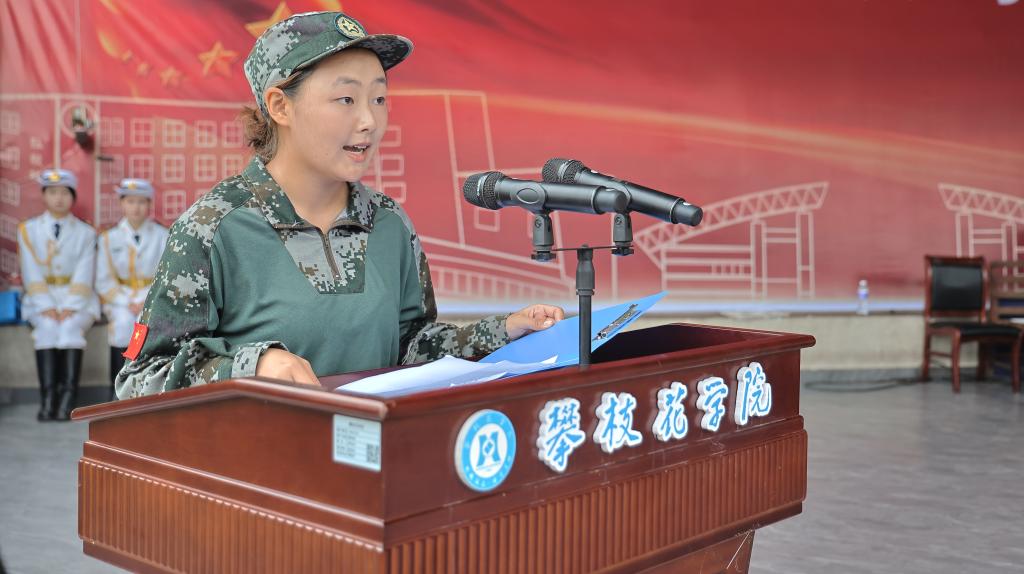 钒钛学院退役大学生宋涛作为优秀教官代表发言。他表示,军训是教官与学员的双向锻造、同步提升,愿同学携吃苦精神与纪律意识登知识高峰,化底气为力量。