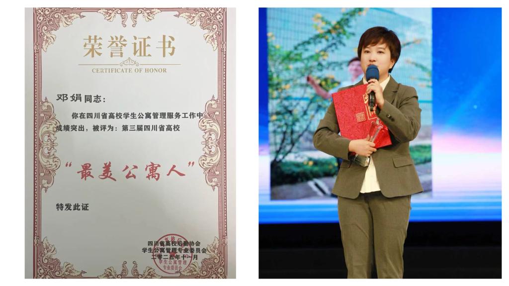 近日,四川省高校后勤协会公布了第三届四川省高校“最美公寓人”评选结果,我校资产经营公司公寓服务中心办公室主任邓娟老师荣获“最美公寓人”荣誉称号,成为全省高校公寓系统12位获此殊荣的先进个人之一。