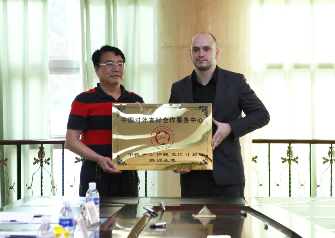 4月14日下午,中德护士(护理)交流计划培训基地授牌仪式在我校办公楼三楼会议室举行。校党委副书记、校长黄双华,中国对外友好合作服务中心人才交流部部长张琳曦,德中友好协会国际友人Roland参加仪式。仪式由副校长何永斌主持。Roland为双方共建中德护士(护理)交流计划培训基地授牌。
