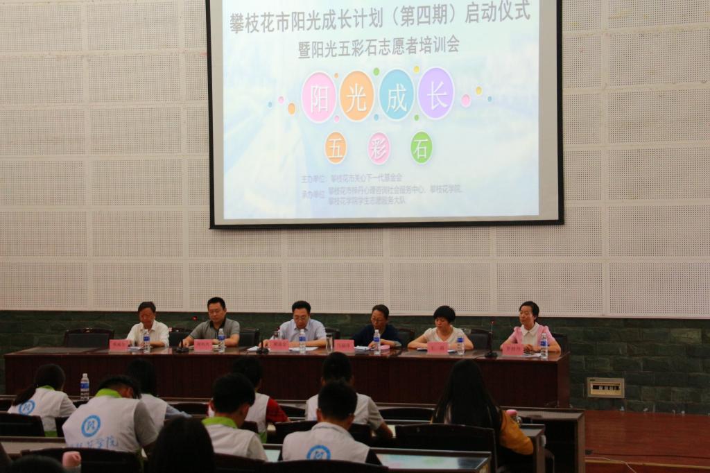 攀枝花市阳光成长计划(第四期)启动仪式暨阳光五彩石志愿者培训会于4月20日下午在攀枝花学院学术报告厅举行。攀枝花市关工委主任谢道全、市关工委副主任马丽萍、团市委副书记王莉、学生处负责人、校关工委常务副主任邓双全及100余名志愿者参加会议。