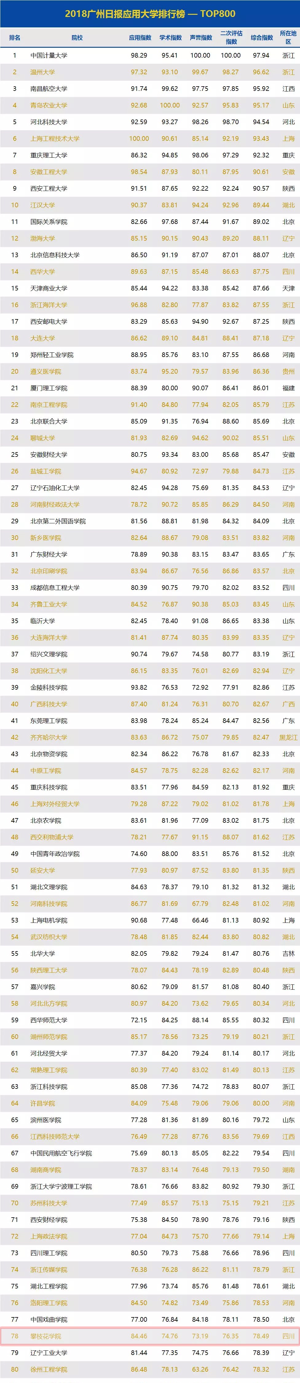 近日,广州日报数据和数字化研究院(GDI智库)发布“2018广州日报应用大学排行榜”,我校排名第78位、位列四川入榜高校第6,相比较“2017年广州日报应用大学排行榜”上升了15位;在“2018广州日报应用大学排行榜—应用指数TOP100榜单”中,我校排名第37位、位列四川入榜高校第2。